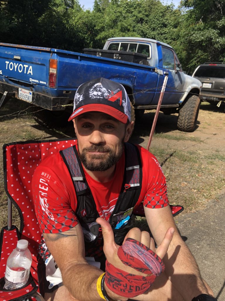 The first time I would see Jen would be at mile 30.3 at the Robinson Flat aid station. There, I would change my shoes as we had crossed a few creeks, some thigh high. I started off wearing my fresh pair of Altra Timp 1.5. They were great in the ice and snow. I would change into my trusty Altra Lone Peak 4.0 for the rest of the race. They are a great balance of cushion, ground feel, and protection. Duncan Canyon was right before Robinson Flatt which meant a gnarly climb. At the Crewing seminar, crews were warned that whereas at other races, aid stations are at the bottom of easy downhills, Western states put their crewed aid stations at the top of steep climbs. The warning was, “your runner will look rough, be prepared.” Well, Jen is used to seeing me come into aid stations all smiles and positive, happy, and ready to go. This day was not that day! I was really happy to see her, but I was feeling less than ecstatic. I actually took a few minutes to sit in the chair and fight cramps while I changed my shoes and socks. We went over all I would need until I saw her again in 25 miles. I loaded my pack and headed out for the next 2 canyons.